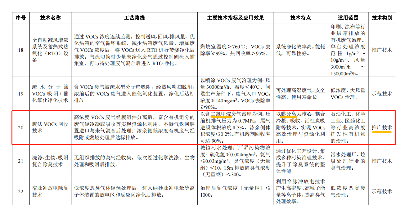 近日,國家生態(tài)環(huán)境部發(fā)布關(guān)于2021年《國家先進(jìn)污染防治技術(shù)目錄(大氣污染防治、噪聲與振動控制領(lǐng)域)》(公示稿)的公示,文件中序號20推薦的污染防治技術(shù)為:壓縮冷凝+膜+吸附工藝,源頭回收VOCs 。特別是二氯甲烷類有機(jī)溶劑蒸汽的源頭回收和達(dá)標(biāo)排放。